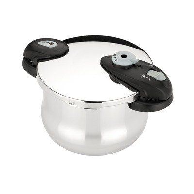 The Fagor Futuro model is the ultimate in the evolution of the pressure cookers. Pressure cooker is constructed with 18/10 stainless steel and comes complete with two short handles for easy storage, an automatic locking lid for added convenience, an easy-cleaning valve, a steamer basket that doubles as a food grater, and a "Tastefully Under Pressure" cookbook with over 90 delicious recipes. Exclusive triple valve safety system plus safety lock on handle prevents opening before all pressure is released. Visual pressure indicator on handle shows when all pressure has been released from cooker. Spring-type mechanism with two pressure settings: LOW (8psi) and HIGH (15psi). Works on all types of domestic stovetops: gas, electric, ceramic and induction. Simple-to-use dial format makes it easy to regulate and release pressure, and remove for cleaning!